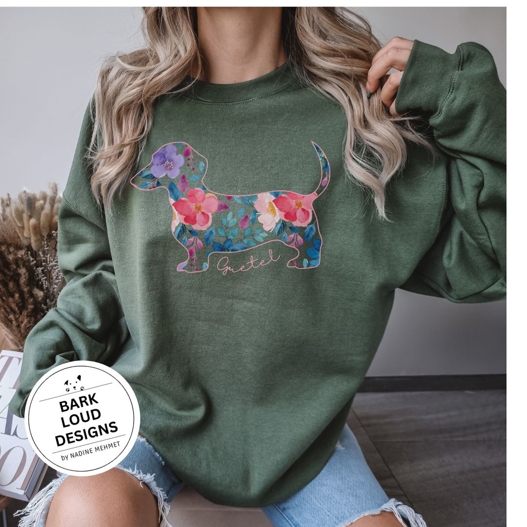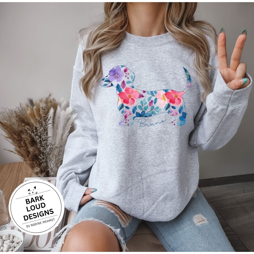 Blumiger Dackel Pullover personalisiert - mit Wunschtext