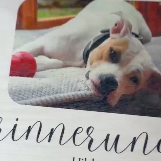Lade einfach dein Lieblingsfoto deines Hundes hoch und füge den Namen/Lebensjahre hinzu. Wir drucken dein Motiv in hochwertiger Qualität auf die Holzkiste.