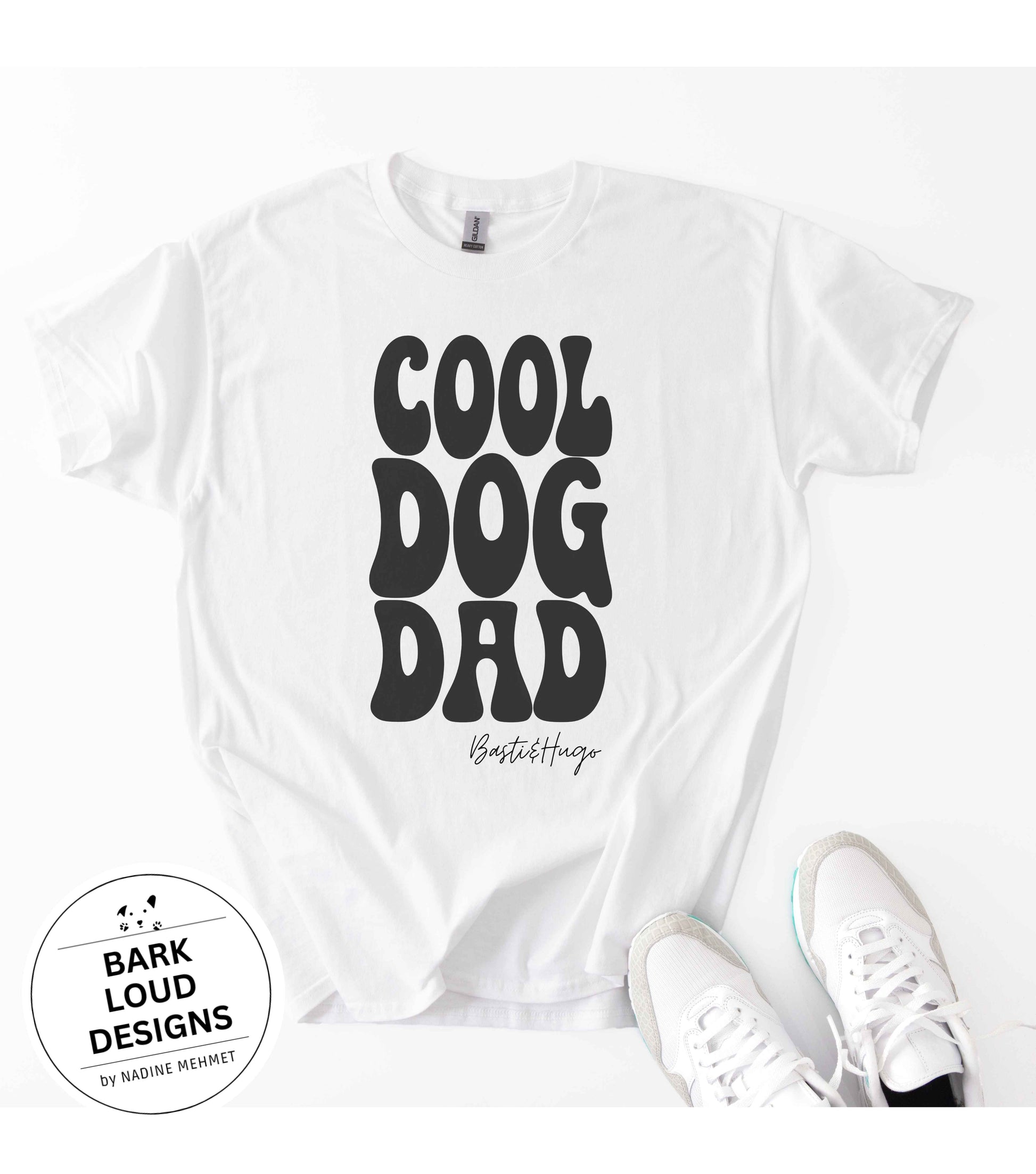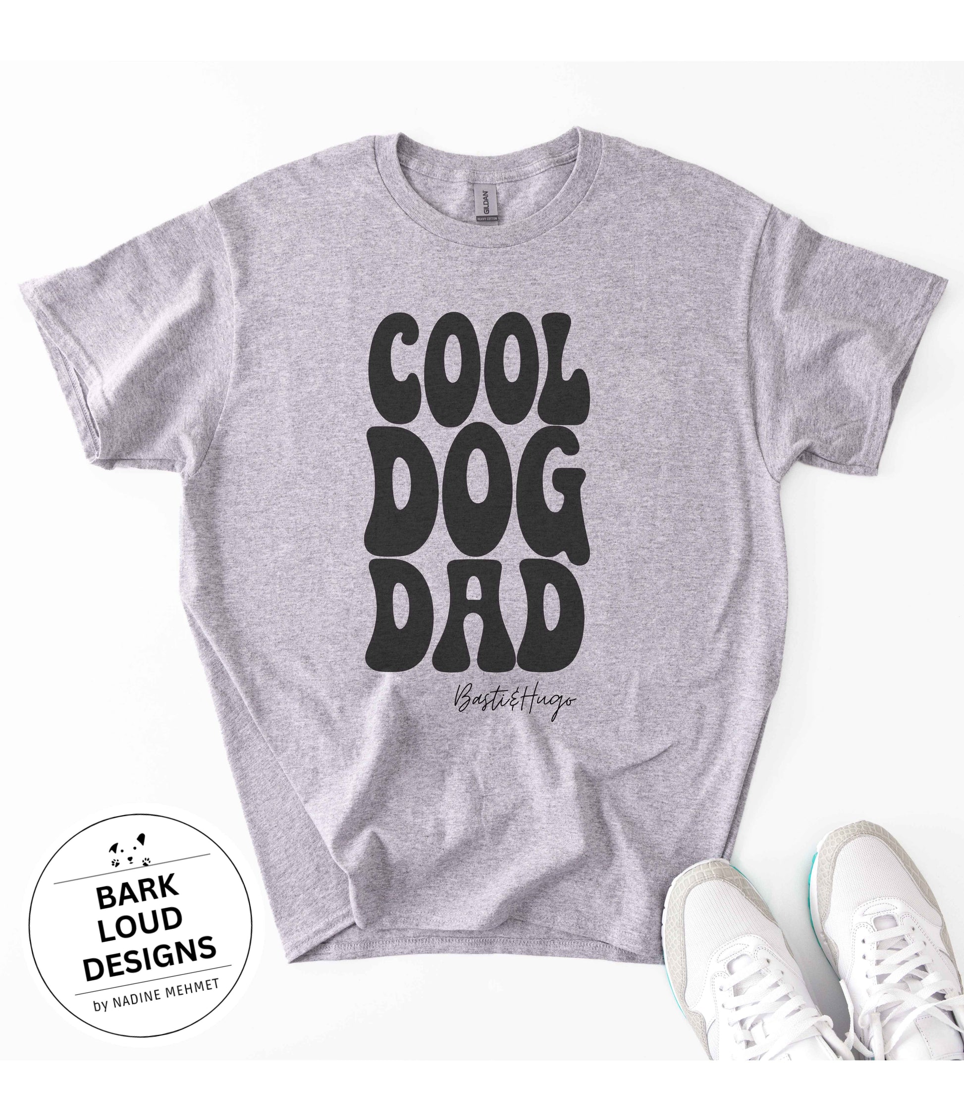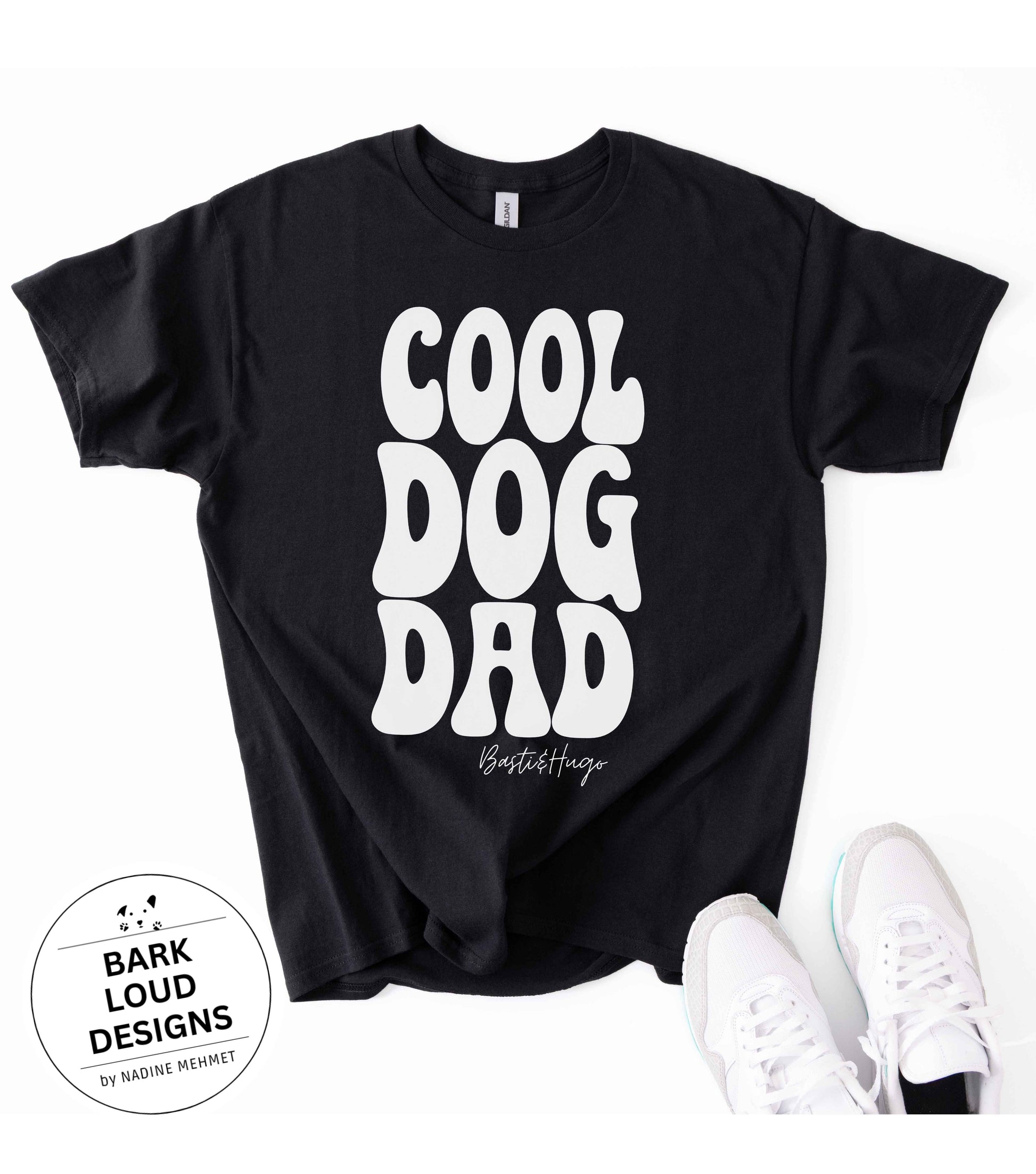 Dieses superweiche T-Shirt ist ein Must-Have für alle stolzen Dog Dads, die ihre Liebe zu Vierbeinern mit Stil zeigen möchten, personalisierbar mit deinem Wunschtext (wird anstelle von Basti&Hugo gedruckt).